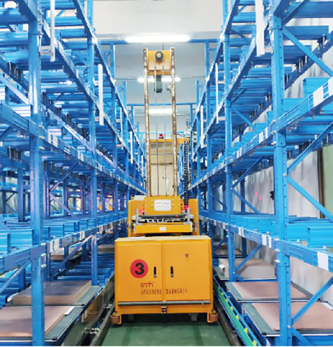 通過車體上配置的堆垛機,與輸送線以及倉儲貨架對接應用