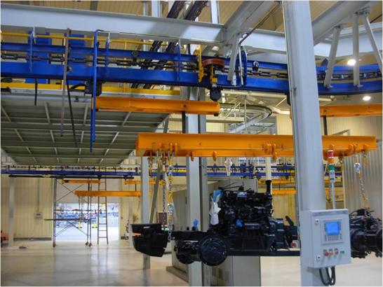中涂色漆罩光積放輸送系統: 中涂、色漆、罩光線機運采用寬推桿積放式懸掛輸送系統,涂裝工件在積放輸送線上,按照工藝要求,完成各涂裝工序,并可以實現中涂烘干室及面漆烘干室零件的排空功能,以及零件和成品零件的緩存編組功能。