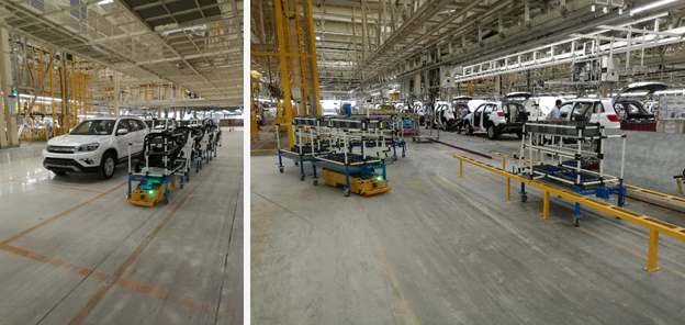北京長安汽車公司屬于重慶長安汽車股份有限公司,主要生產中高端SUV車型,該AGV項目用于總裝車間底盤線、終裝線物流配送。配送方式采用SPS供給模式,將物料按正確的數量在準確的時刻運送到正確的地點,實現無人化配送,滿足生產線60JPH節拍。AGV采用磁道航導引系統,并通過控制系統與其他管理系統即時通訊,可實現無人自動化運輸,是汽車行業等提升行業競爭力、減少人工成本、提高倉配效率的選擇。