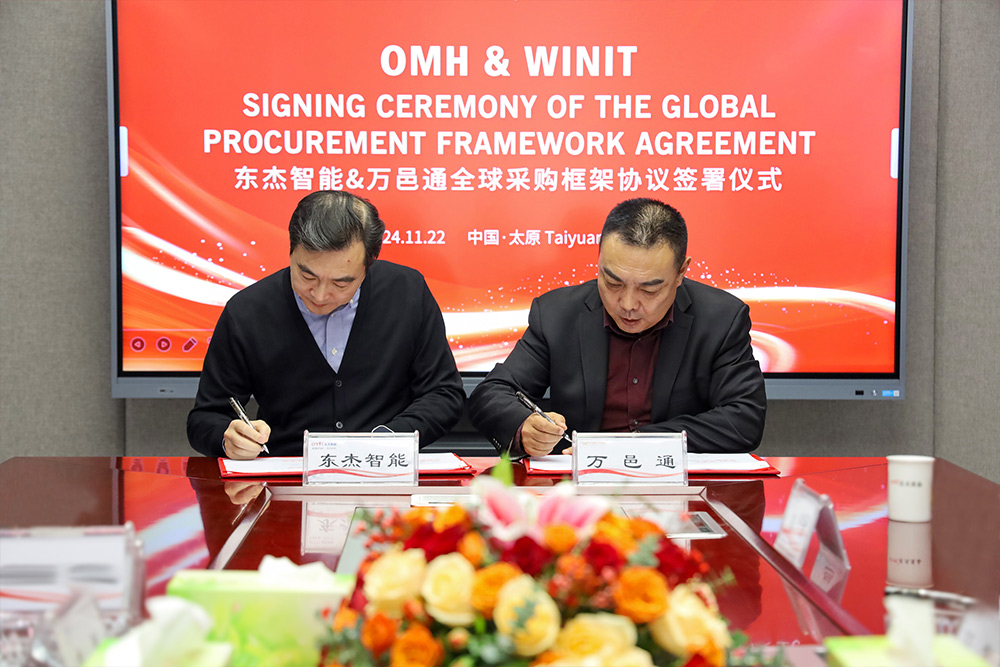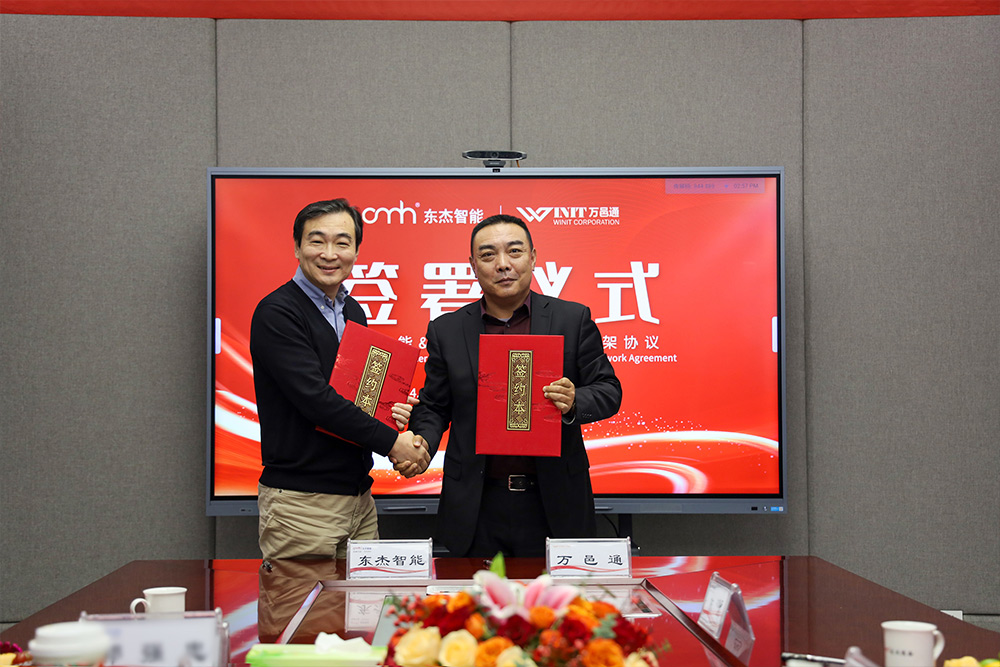 簽署儀式上,雙方代表在熱烈的掌聲中完成了合同簽署,并合影留念。這次簽署儀式的成功舉行,標志著東杰智能與萬邑通的合作進入新階段,也為雙方未來在更多領域的合作奠定了堅實的基礎。